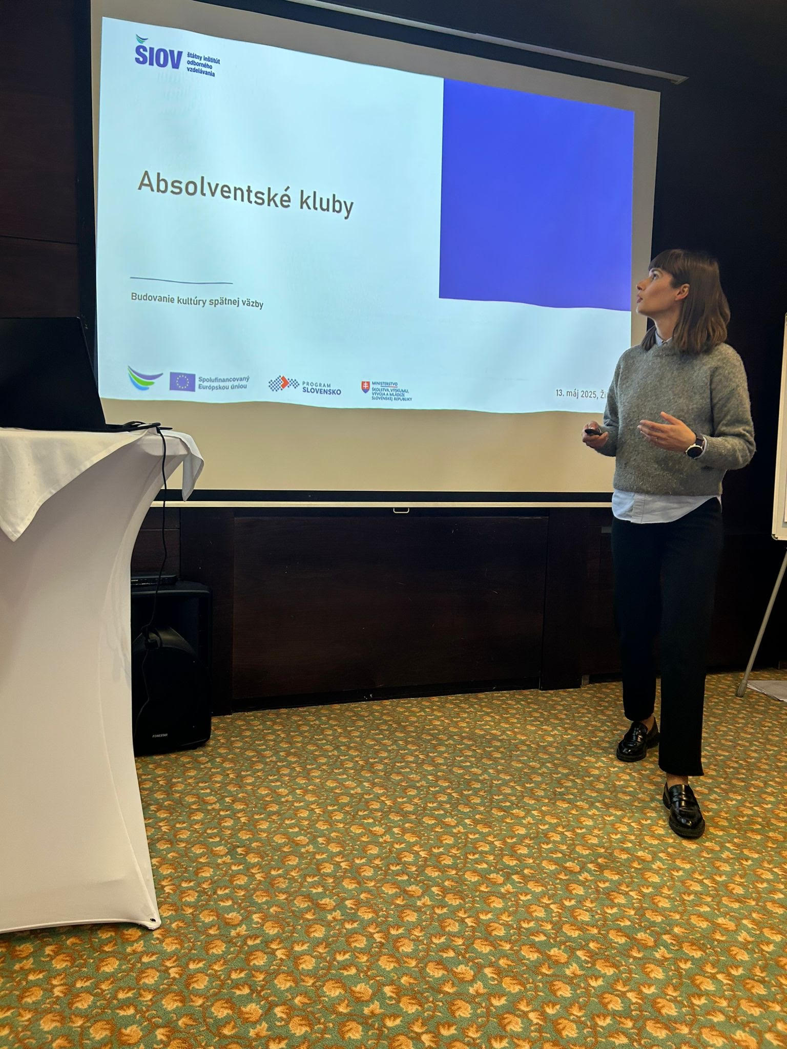 Podujatie v Žiline (13. mája) Spätná väzba od absolventov ako nástroj zabezpečovania kvality OVP otvorilo tému trasovania absolventov. Účastníci diskutovali o tom, ako efektívne získavať a využívať spätnú väzbu od bývalých žiakov na zlepšovanie školských procesov a kvality vzdelávania. Vysoká účasť potvrdzuje pretrvávajúci záujem o túto tému a potrebu konkrétnych nástrojov pre prácu so spätnou väzbou.